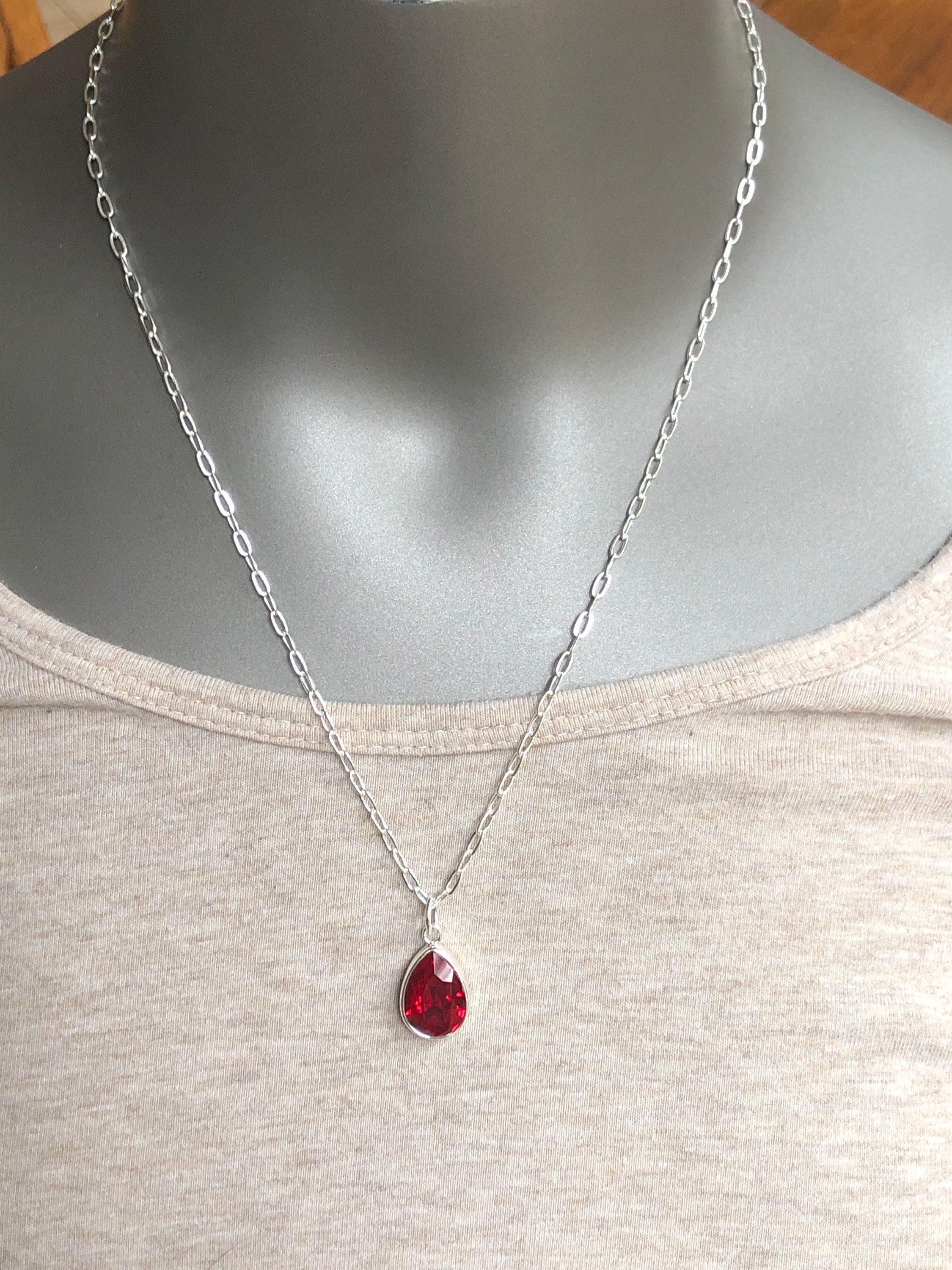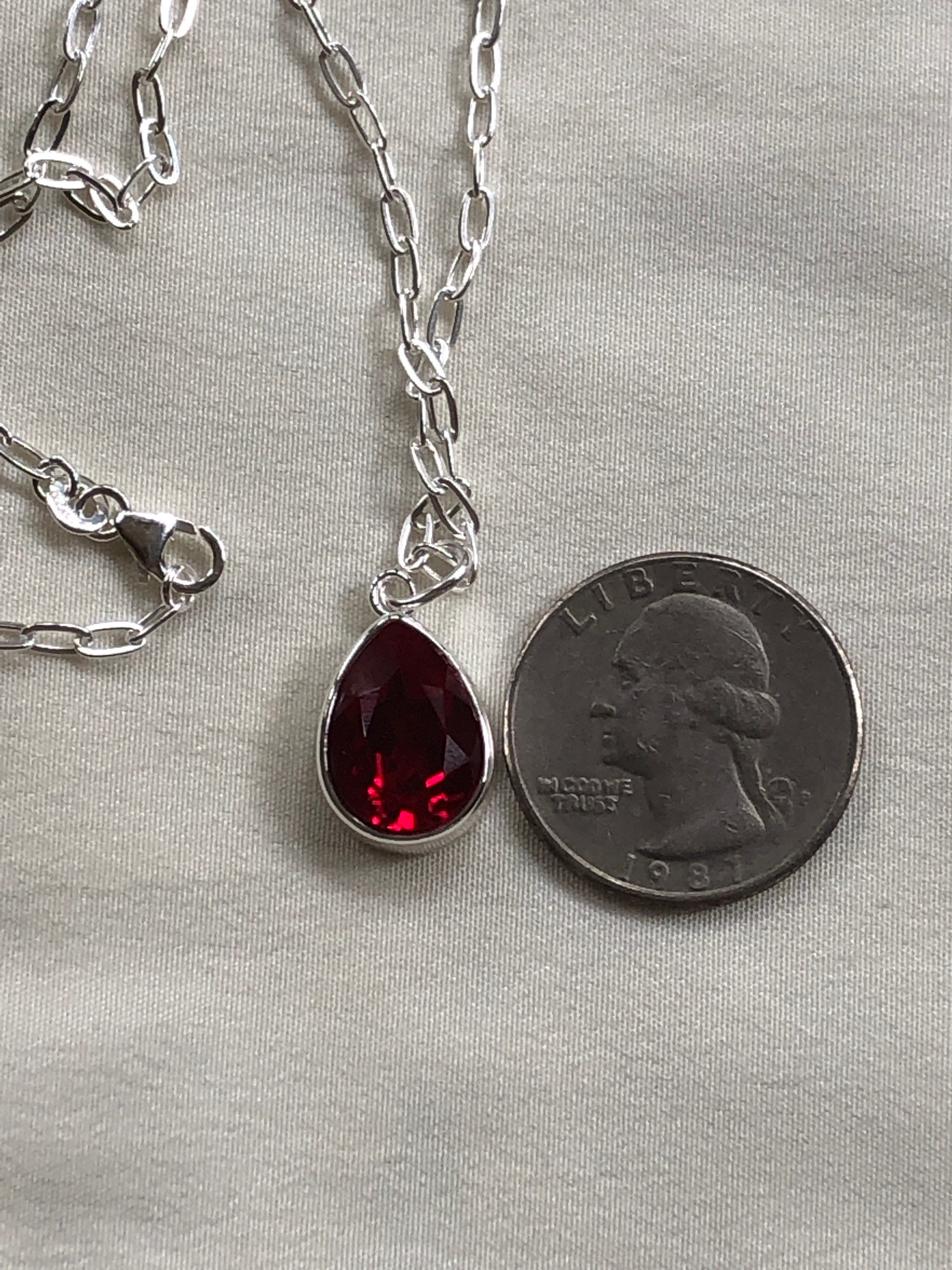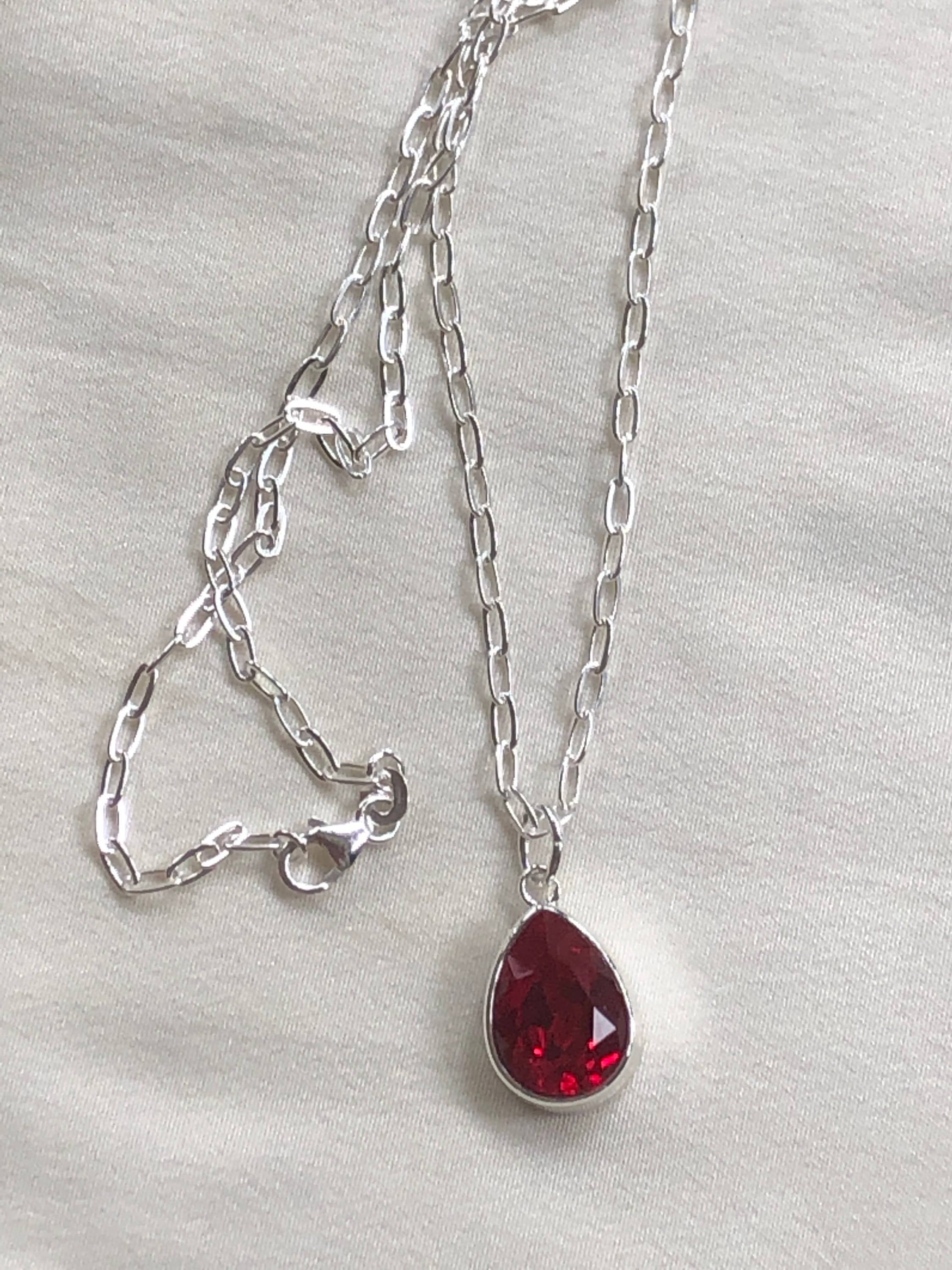 This beautiful and large necklace is a pear/teardrop shape and available in a stunning ruby red Swarovski crystal. The setting for this necklace is 0.5mm thick. This necklace is a unique shape and it get's noticed! It is easily dressed up as well as casual for daily use. The pear/teardrop setting is attached to sterling silver chain that is 20 inches long. The crystals are faceted to reflect the light. The Swarovski crystals are glued into the setting. This necklace is a perfect length to compliment many different neckline styles. I use quality material and give extra attention to every detail.