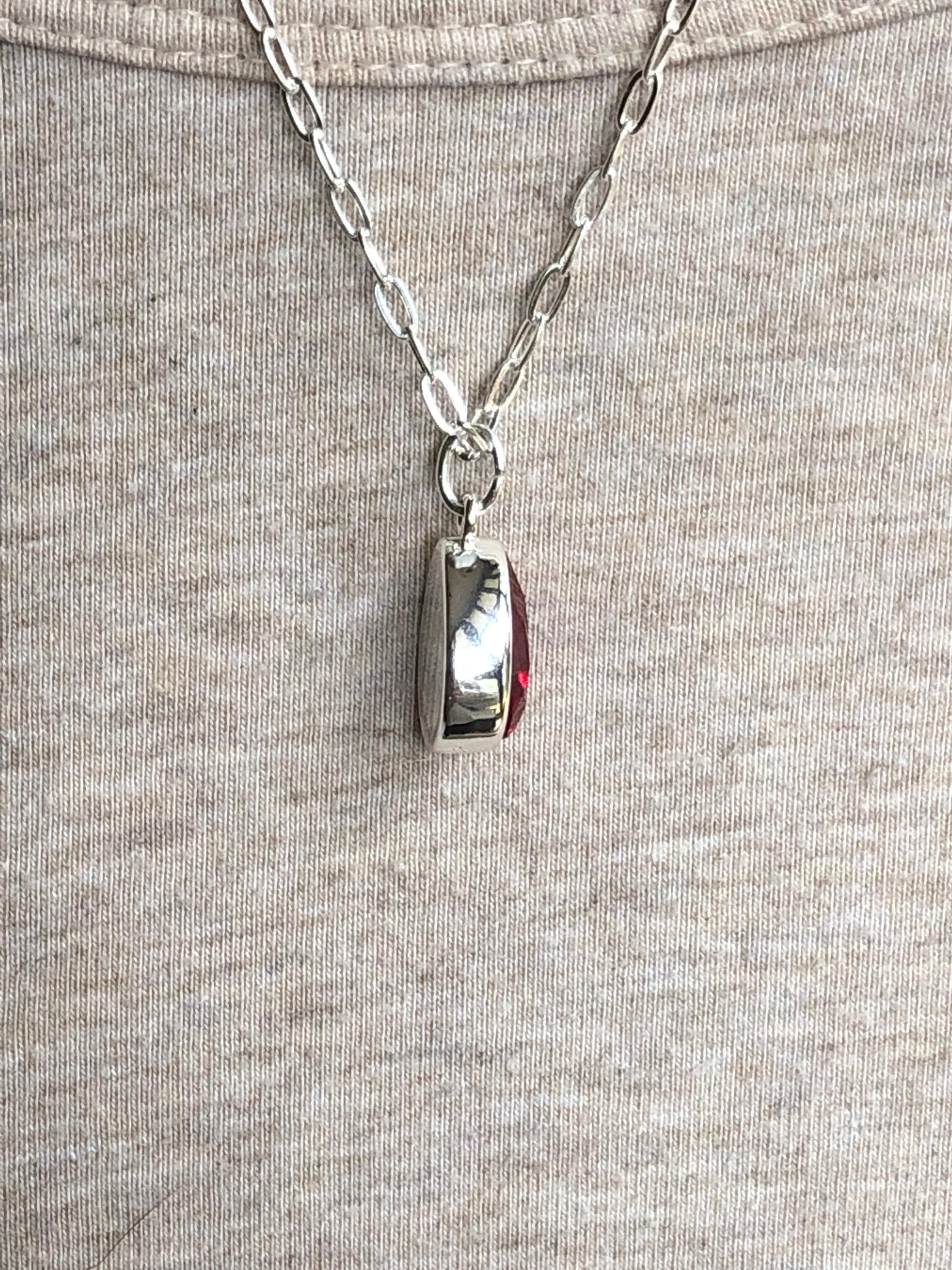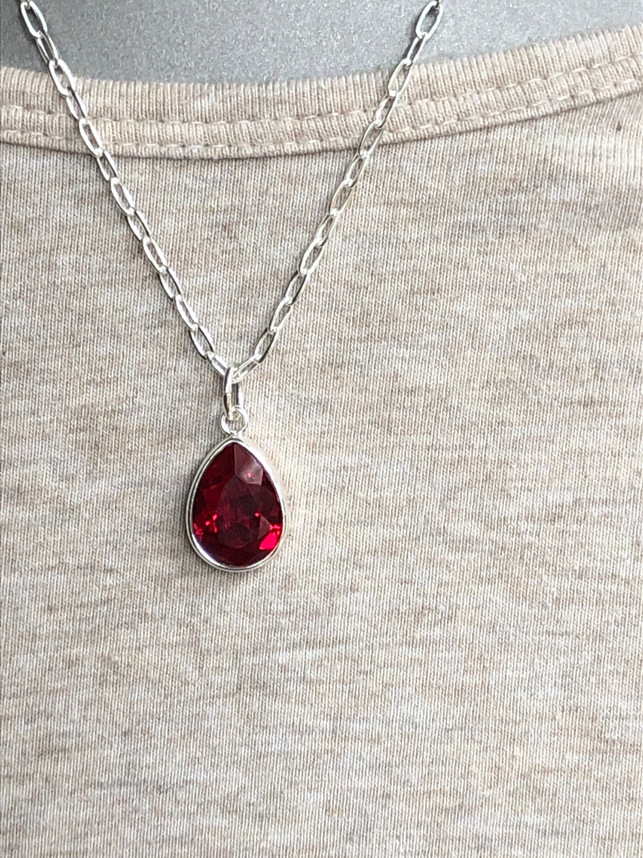 This ruby red Swarovski crystal pear shaped necklace is a show stopper. The chain is a stunning sterling silver cable style that is a perfect compliment to the teardrop shape of the pendant and the stunning ruby red Swarovski crystal. This necklace has an art deco vibe. The ruby red and the sterling silver are a perfect combination.