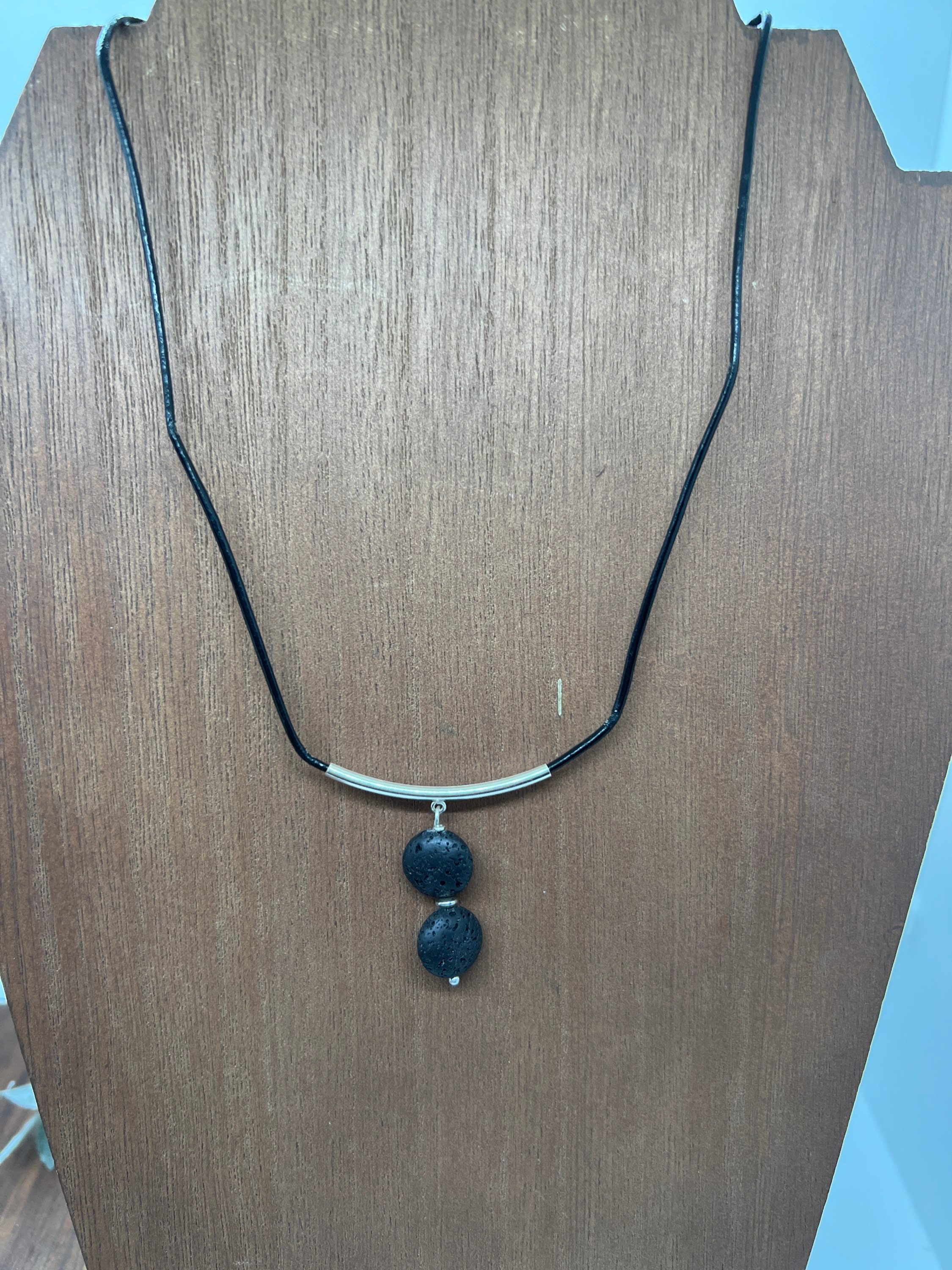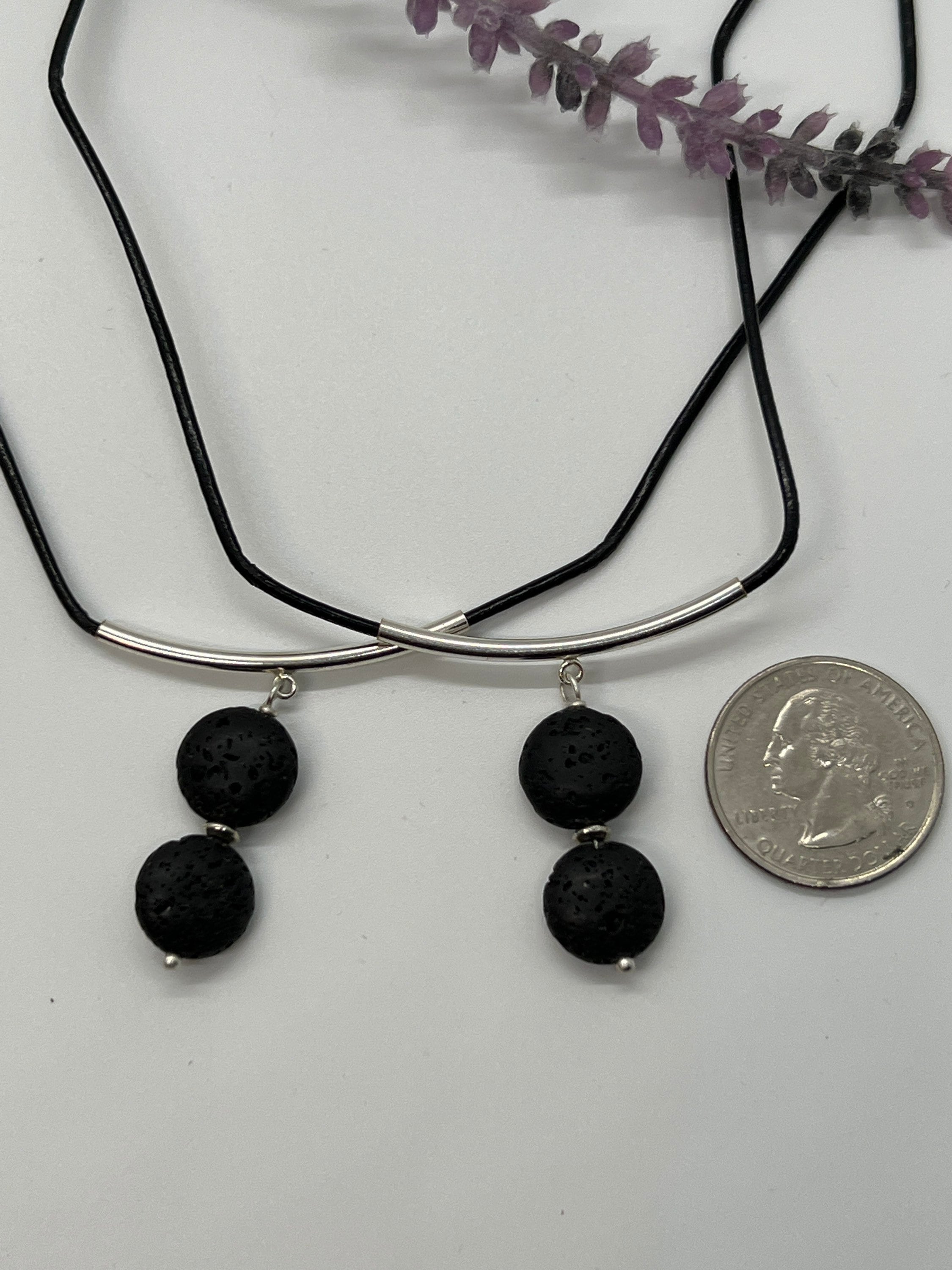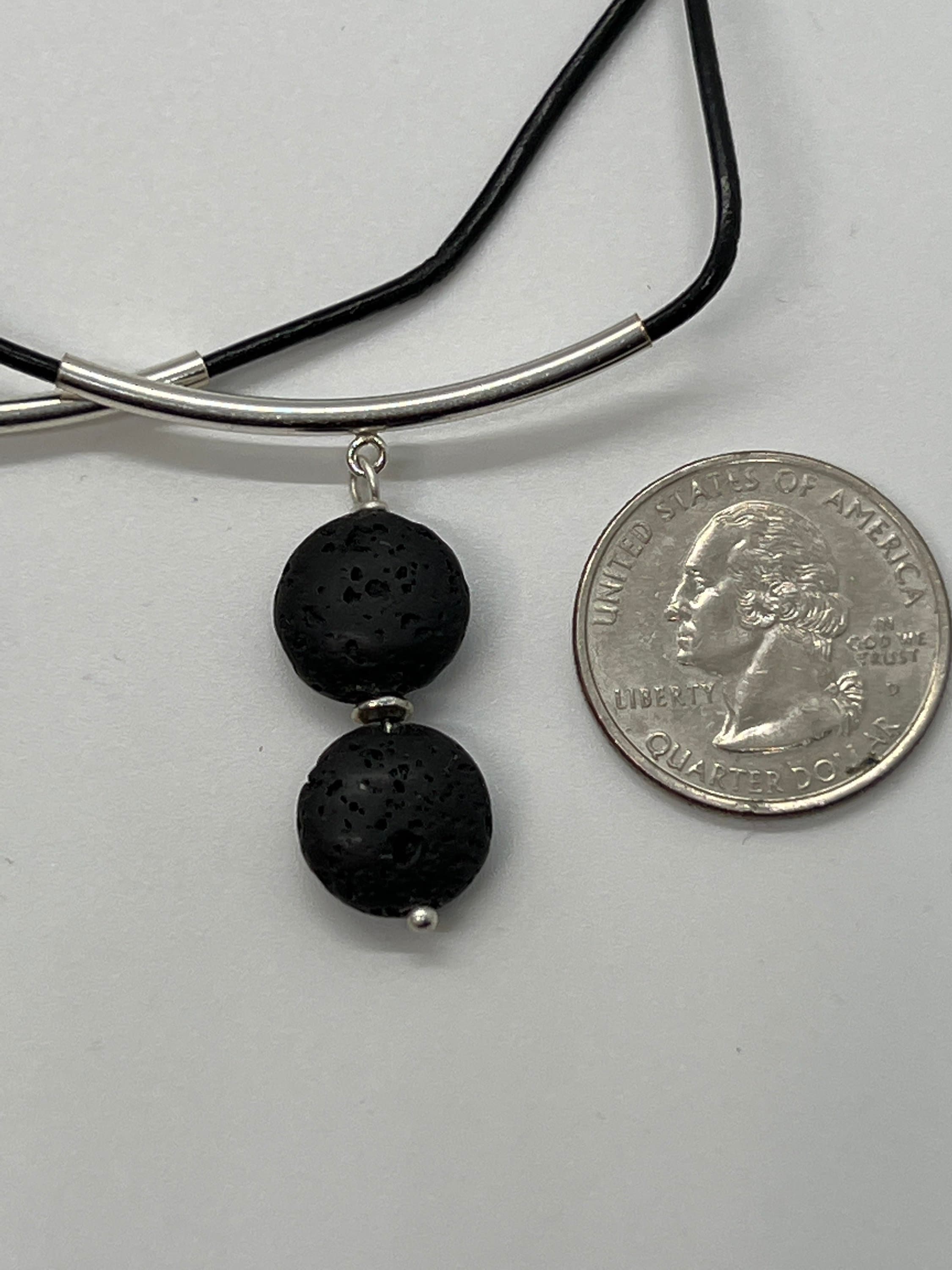 The coin shaped lava stones are stacked, and hand wired together. The lava stones are hand wired together using a nickel free head pin and has a small decorative spacer between the lava stones. The stones are great for a simple one essential oil scent or a blend of your choice. The leather is rolled and polished and is a thin 2mm thick. The silver tube has a slight curve that the lava stones are attached to. The ends are nickel free lobster claw.