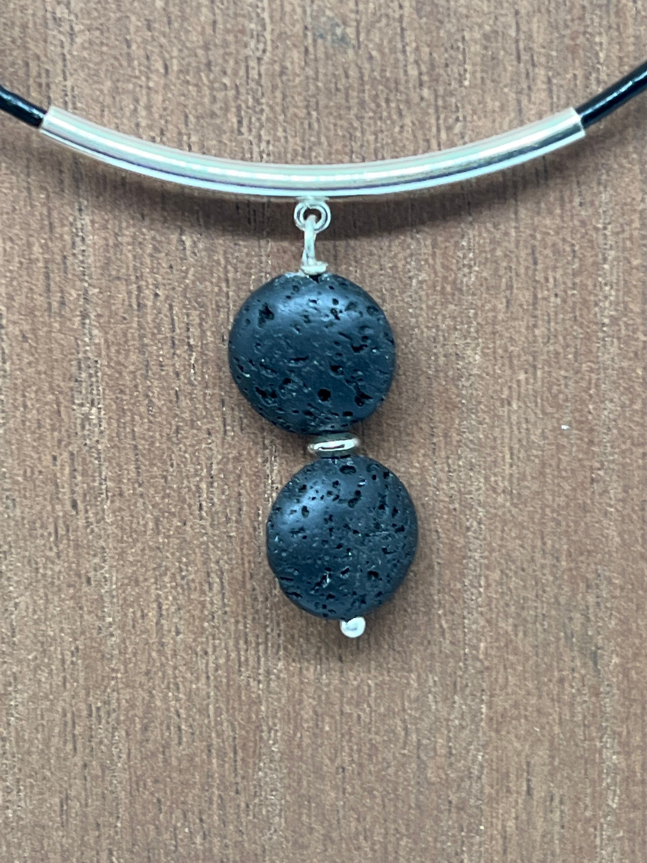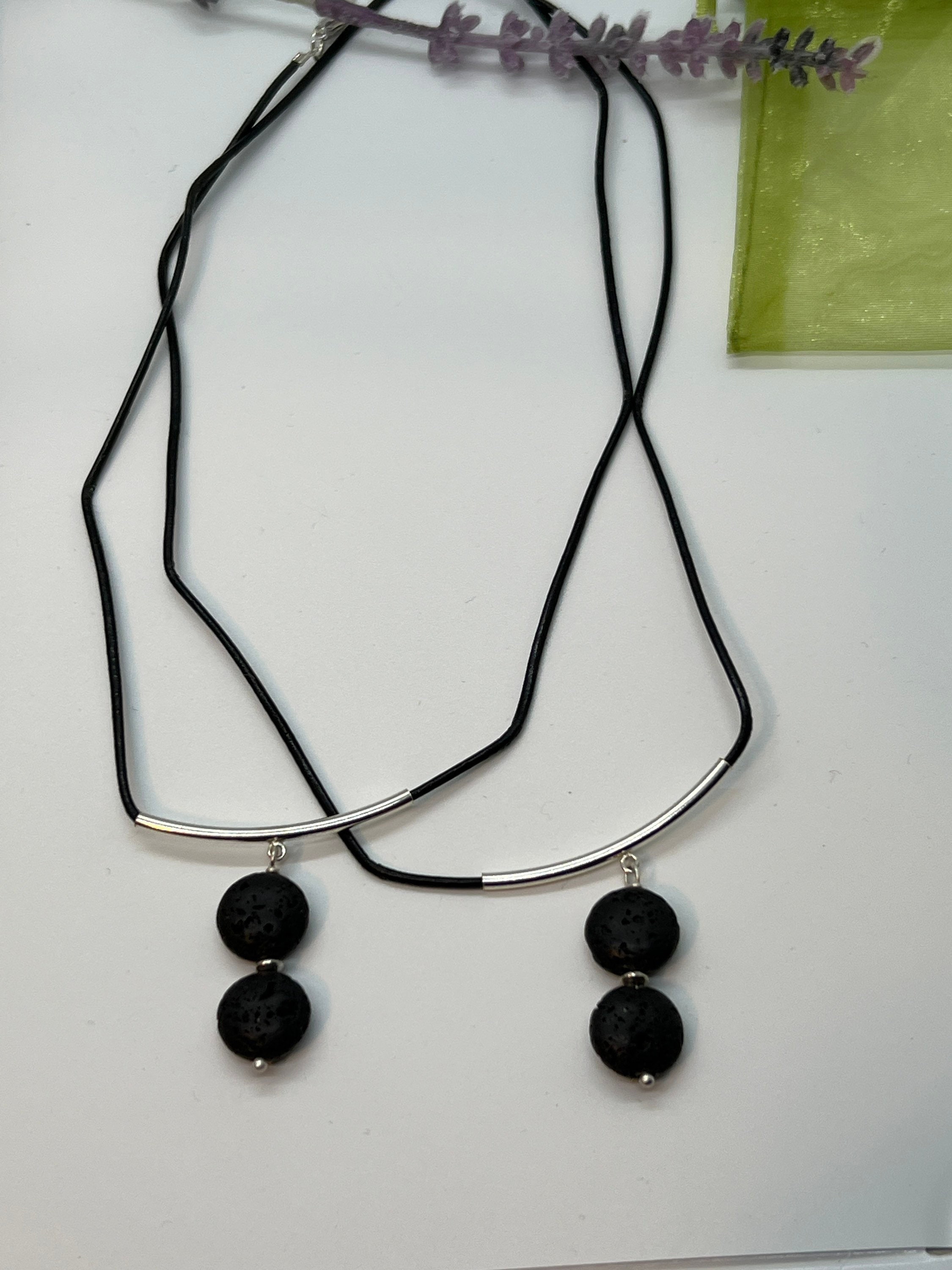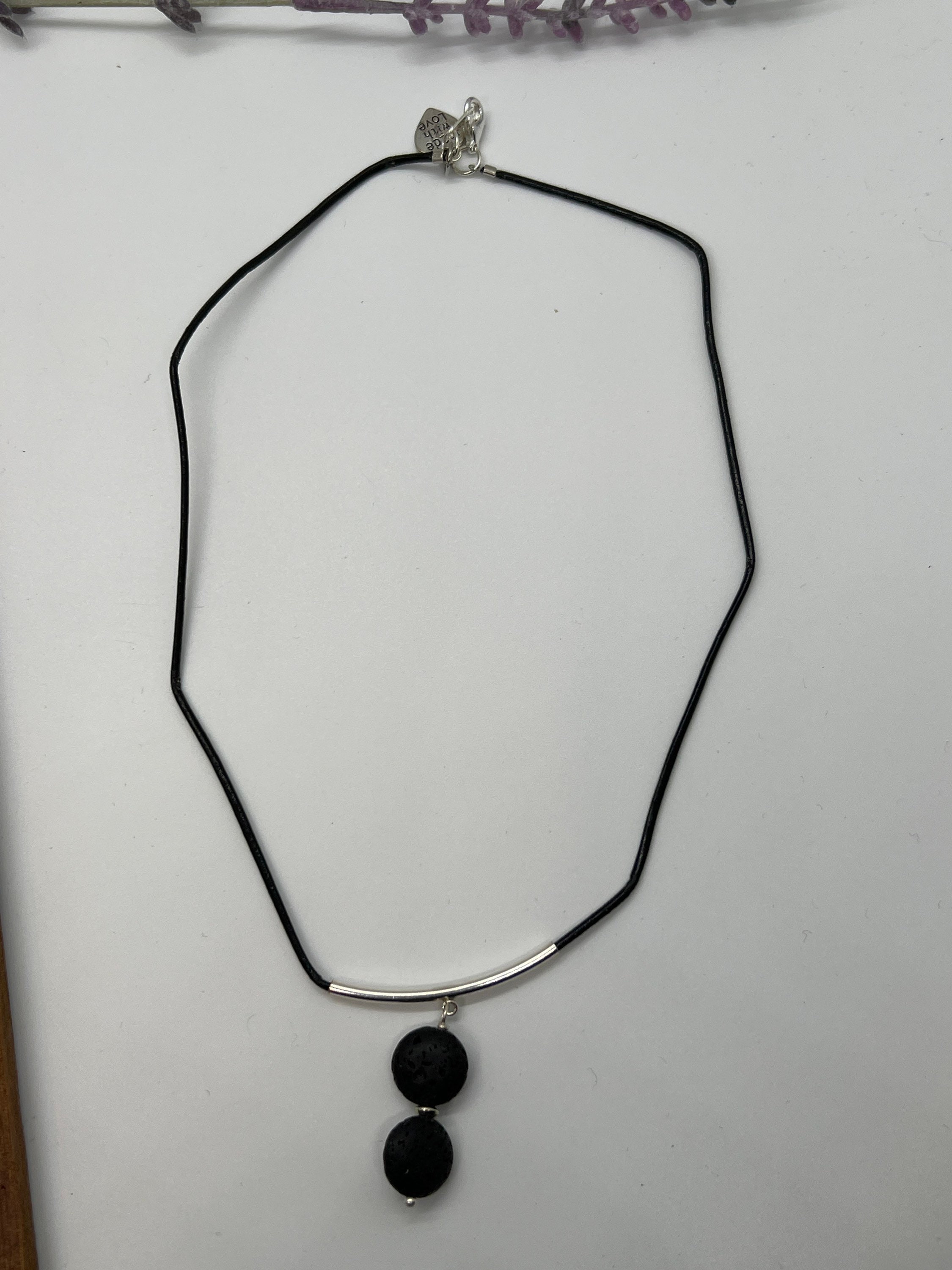 The coin shaped lava stones are stacked, and hand wired together. The lava stones are hand wired together using a nickel free head pin and has a small decorative spacer between the lava stones. The stones are great for a simple one essential oil scent or a blend of your choice. The leather is rolled and polished and is a thin 2mm thick. The silver tube has a slight curve that the lava stones are attached to. The ends are nickel free lobster claw.