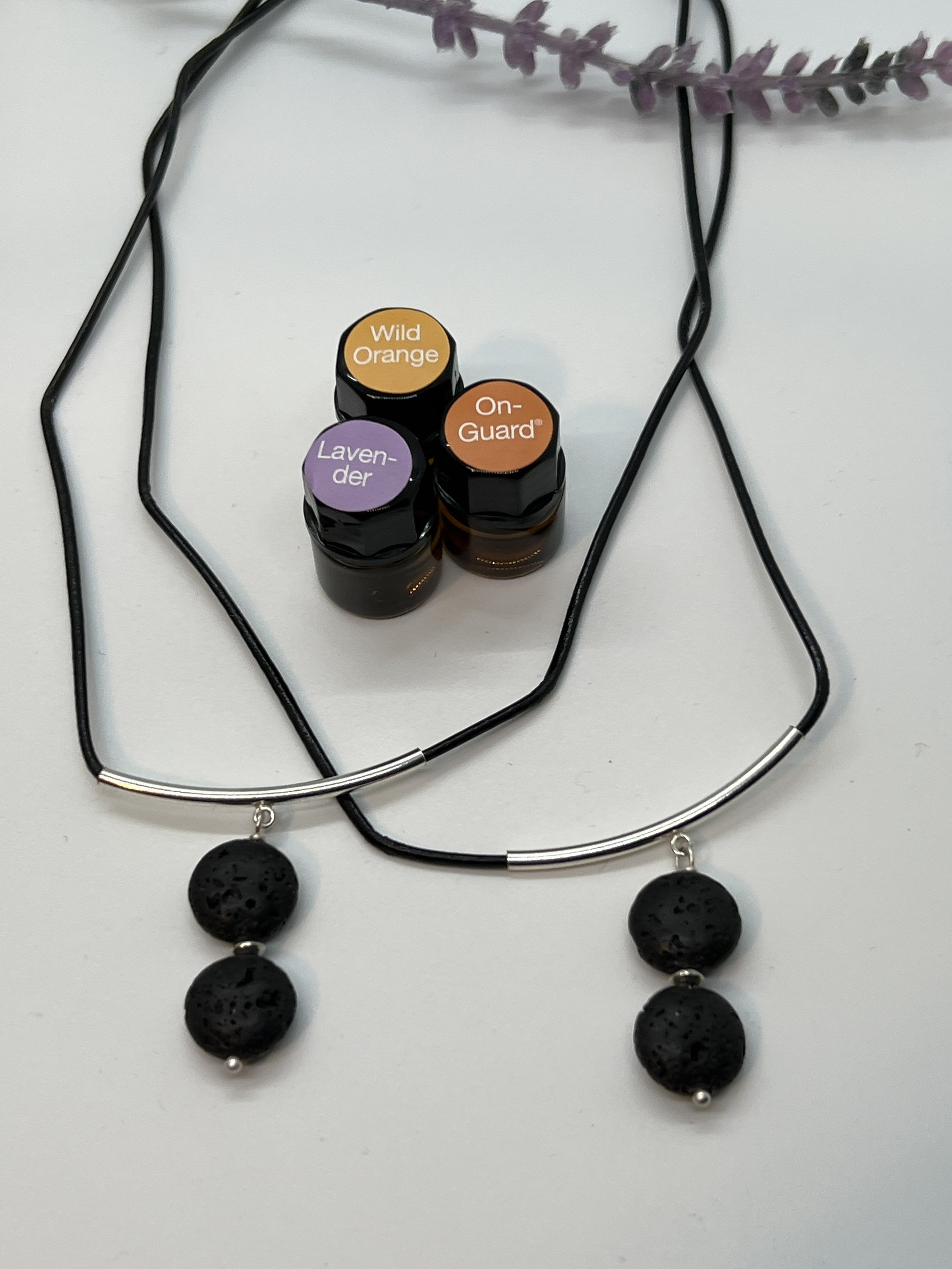 Beautiful black rolled leather cording with a small nickel free tube. Attached are 2 lava stones that are coin shaped and are the perfect medium for this diffuser essential oil necklace. The cording is short enough to keep the stones close to your face so you can enjoy all the benefits of the essential oil. The simple design of this necklace is perfect for every day.
